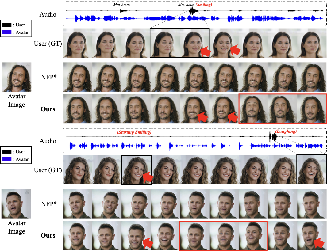However, existing avatar generation models fail to fully replicate the feeling of real face-to-face interaction. They primarily focus on generating audio-synchronized lip or natural head motionsĀ to deliver information accurately and naturally, rather than engaging in interactive conversations. Such one-way interaction overlooks the bidirectional nature of real-life conversations, where the continuous exchange of verbal and non-verbal signals plays a crucial role in communication. For instance, active listening behaviors such as nodding or empathic responses encourage the speaker to continue, while expressive speaking behaviors such as smiling or making eye contact contribute to a more realistic and immersive conversation.