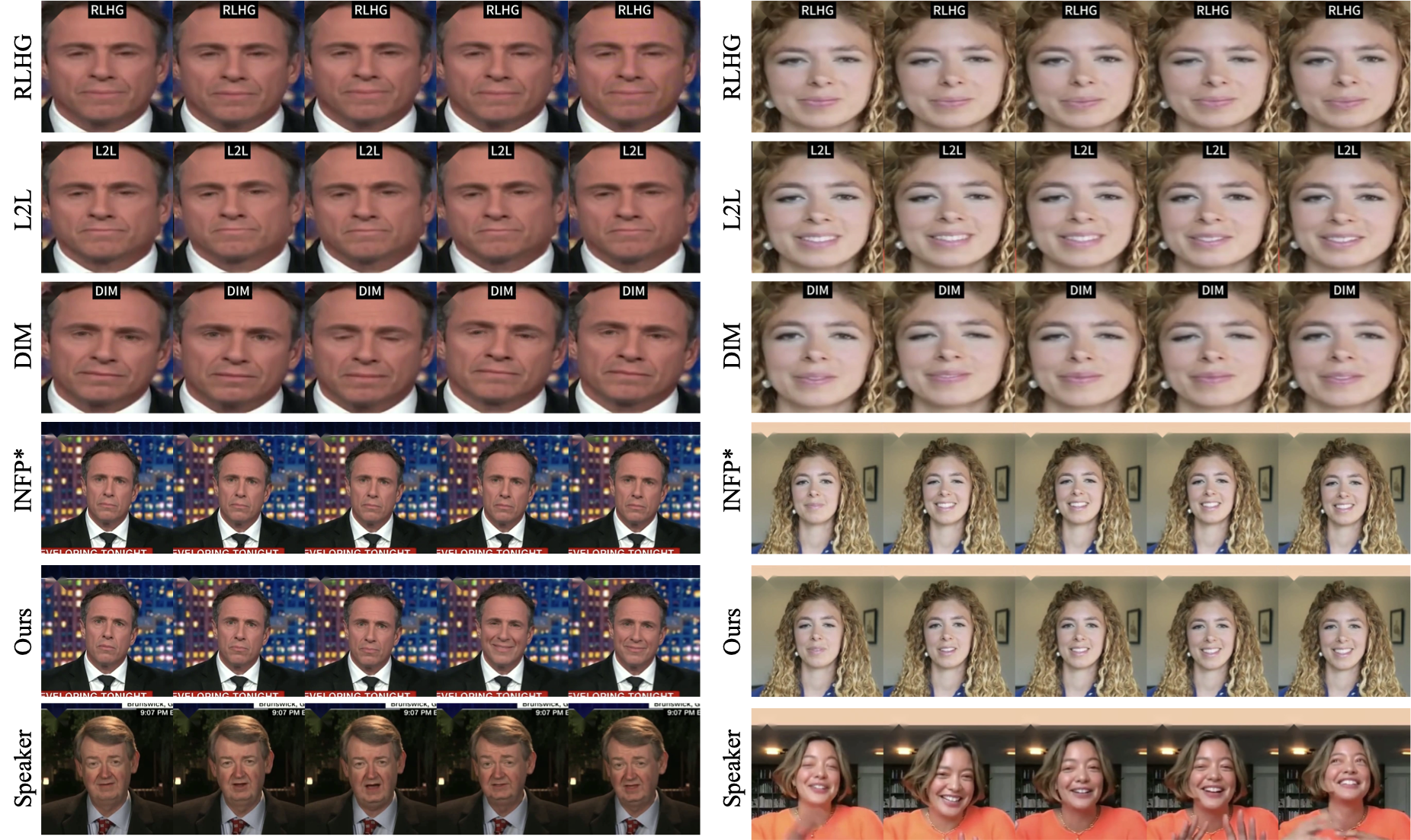 InĀ 18, we compare our model with RLHGĀ , L2LĀ , DIMĀ , and INFP*Ā for listening head avatar generation. Avatar Forcing can generate competitive results with more expressive facial expression. Please refer to ā03_listening_XX.mp4ā for video results.