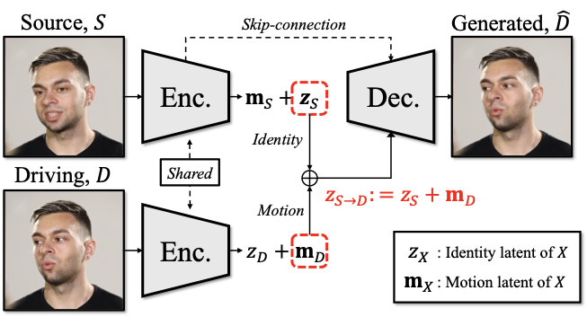 where $`z_{S}\in\mathbb{R}^d`$ and $`\mathbf{m}_S\in\mathbb{R}^d`$ are the identity and motion latents, respectively. The identity latent $`z_S`$ encodes identity representation of the avatar image $`S`$ (e.g., appearance), while the motion latent $`\mathbf{m}_S`$ encodes rich verbal and non-verbal features (e.g., facial expression, head motion). We use this latent representation to capture holistic head motion and fine-grained facial expression, which are crucial for realistic head avatar generation. We provide more details on the auto-encoder in AppendixĀ B.