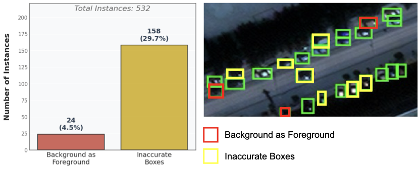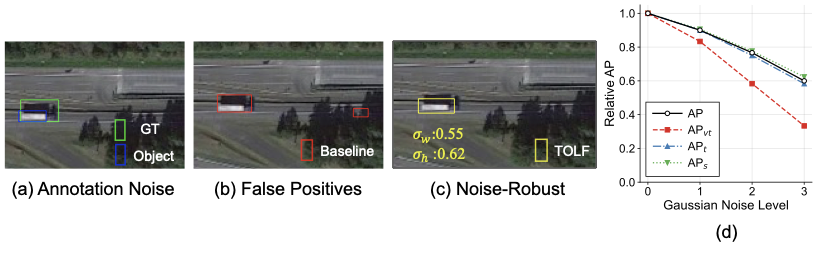 validated on the AI-TOD test. In this work, we reveal that tiny objects are vulnerable to annotation noise and risks overfitting. Due to limited resolution and visual ambiguity manual annotations of tiny objects often suffer from labeling inconsistencies, including missed objects, inaccurate bounding boxes, or incorrect classes . To quantify the prevalence of annotation noise in real-world tiny object datasets, we manually reviewed 532 bounding boxes across 10 randomly selected images from AI-TOD test in Fig. 2. Results show that nearly 34.2% of annotations are noisy. These errors are exacerbated by the IoU sensitivity of tiny objects, where even a minor deviation can dramatically alter localization quality. A trivial 2-pixel shift leads to over 20% IoU drop for a 10Ă10 object, whereas the same error would only cause  5% degradation for a 100Ă100 object. Under such conditions, optimizing for strict localization criteria (e.g., 1.0 IoU) can cause models to overfit annotation noise rather than learning effective regression. Illustrated in Fig. 1 (b), the overfitting can result in increased false positives in background regions. Moreover, we conduct a noise sensitivity analysis to quantify the impact of training-time label noise across object scales. We inject Gaussian noise with standard deviation $`\sigma \in \{1.0, 2.0, 3.0\}`$ pixels into the centers of training bounding boxes and evaluate on clean data. As shown in Fig. 1 (d), performance decresed with increasing noise levels across all scales, with the largest degradation for tiny objects. At $`\sigma=3.0`$ pixels, overall AP decreases by 40.0%, while AP for very tiny and tiny objects decreases by 66.7%. This heightened sensitivity to annotation noise highlights the importance of robust localization objectives in tiny object detection.