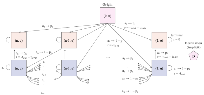 At each timestep, let action $`a_i \in \mathcal{A} = \{ 1, \dots, N \}`$ represent an attempt to park at lot $`i`$. Note that since there is no $`a_0`$, a vehicle cannot attempt to stay at or return to the origin. This attempt succeeds with a lot-specific probability $`p_i \in \mathcal{P}`$ and fails with probability $`1 - p_i`$. We assume $`p_i \in (0, 1]`$. Let $`r_{i, (j, \{u, o\})} \in \mathcal{R}`$ represent the instantaneous reward incurred in the process of a vehicle beginning in state $`(i, u)`$ and taking action $`a_j`$ to park in a different lot $`j`$. If this succeeds, it incurs reward $`r_{i, (j, o)} = -t_{i \rightarrow j} - t_{j \rightarrow D}`$, where $`t_{i \rightarrow j}`$ represents the drive time from $`i`$ to $`j`$ and $`t_{j \rightarrow D}`$ represents the walk time from lot $`j`$ to the true destination $`D`$. If the attempt fails, it only incurs drive time reward $`r_{i, (j, u)} = -t_{i \rightarrow j}`$. If the vehicle remains unparked at any lot, it has two options for the following timestep: either seek to park at a new lot $`k`$ or else wait at the current lot for another chance at parking. The former incurs a reward of the formula just described, $`r_{j, (k, u)}`$ or $`r_{j, (k, o)}`$. Let $`t_{\text{wait}}`$ indicate a wait time incurred for remaining at a lot and waiting for another chance at parking. The latter incurs a reward $`r_{j, (j, o)} = -t_{\text{wait}} - t_{j \rightarrow D}`$ if it successfully parks and $`r_{j, (j, u)} = -t_{\text{wait}}`$ if it does not. In summary, the possible rewards can be described: