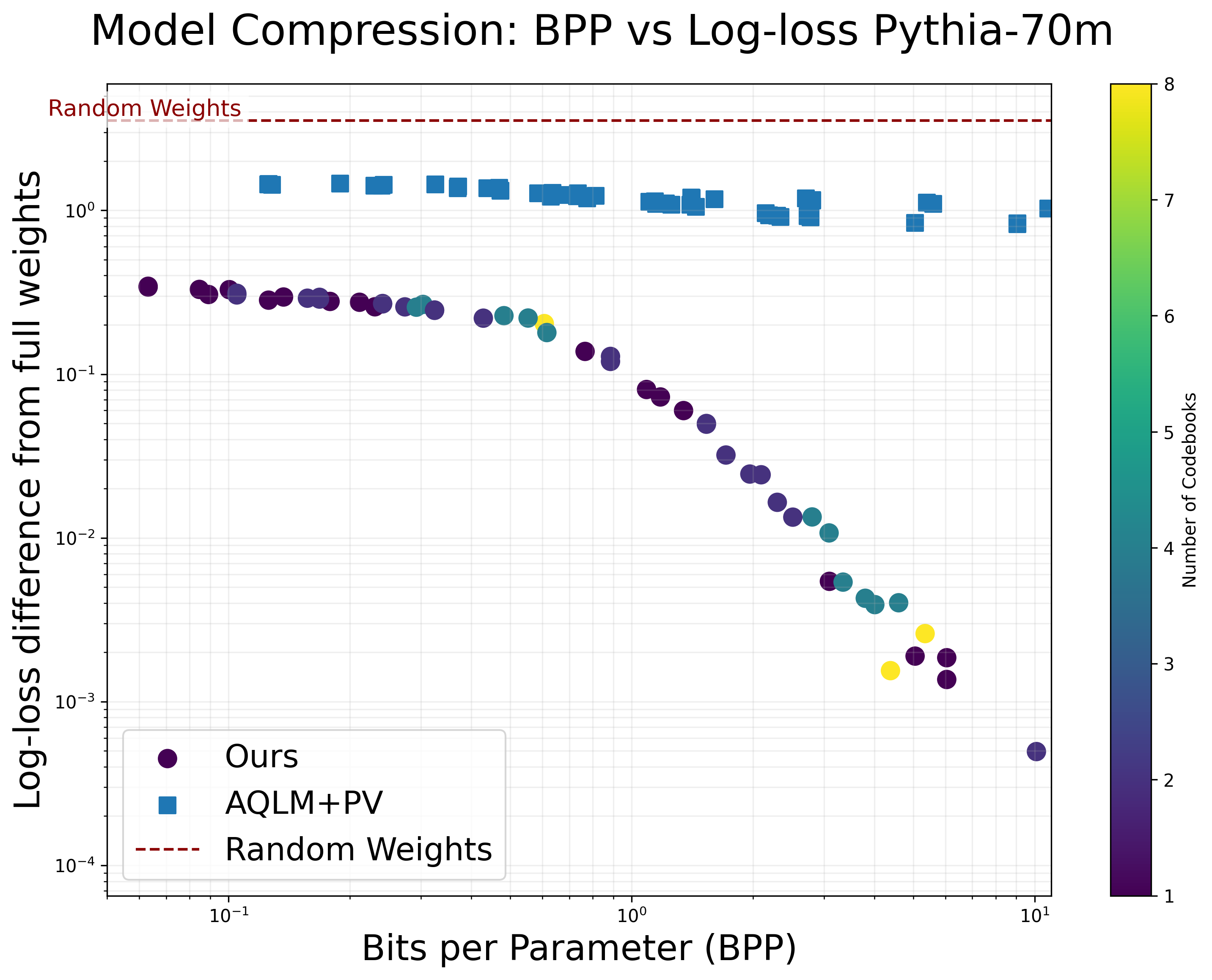 Our main results in [tab:compression-comparison-combined] show that models can be compressed using our method with very little degradation in downstream metrics like log-loss. To obtain a more fine-grained view of how our method performs at different BPP values, we applied it to a range of smaller models in the Pythia suite. In 10 (left), we show that the log-loss for our method starts out much closer to the original model than AQLM enhanced with PV tuning , a state-of-the-art quantization method. Performance of our method smoothly degrades with an elbow around $`0.1`$ BPP.