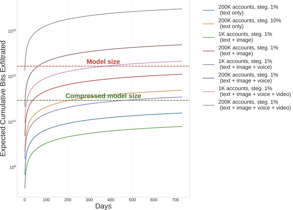 To demonstrate that smaller, compressed weights are easier to steal, we use a simple quantitative model roughly calibrated to the scenario of a weight exfiltration attack on GPT-4 . Our model computes the time required for exfiltration and the probability of success given a fixed daily probability of detection. We say attack fails if it is detected before the model is fully exfiltrated, in keeping with our threat model. Our model incorporates various factors and three different usage profiles, allowing us to study a wide variety of attack scenarios. We describe these below.