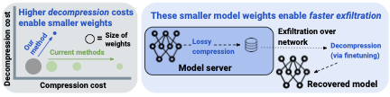 A common tactic in standard data exfiltration attacks is to compress data before transmission over the network , reducing the likelihood of detection. However, this tactic has not been extensively studied in the context of weight exfiltration attacks. While prior work on large language model (LLM) compression has focused on optimizing models for efficient inferenceāachieving high fidelity with up to $`4\times`$ compression āthe requirements for inference differ significantly from those in weight exfiltration scenarios. In particular, existing methods are designed to have an efficient forward pass after the initial compressionā we refer to the cost of obtain useful weights after they have been compressed as the ādecompression costā in 1. These differences suggest that more aggressive lossy compression techniques, tailored for exfiltration, could be feasible, leading to a higher risk of successful attacks.
