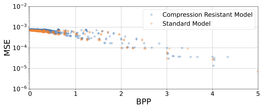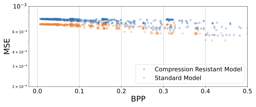 In 3, we show MSE rate distortion curves for models of various sizes. Interestingly, these reveal that within the Pythia family, the MSE of compressed models gradually improves as model size increases. This is surprising, as MSE is not dependent on the number of parameters. Even more surprising is the striking change in the Pareto frontier between Llama-3-8B and Llama-3-70B, the latter of which maintains very low MSE down to $`0.1`$ BPP with almost no degradation. These results provide evidence that larger models are easier to compress with our method, implying that the relative benefit of compression during exfiltration attacks may increase as models continue scaling up.