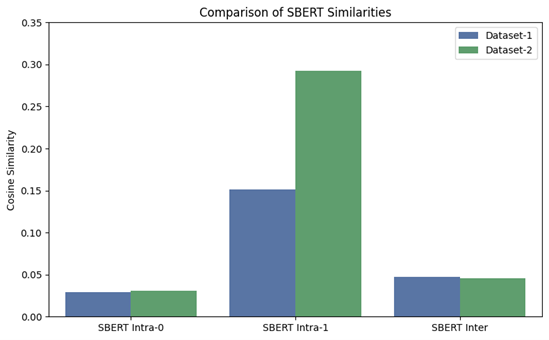 To further investigate the differences in model performance on both datasets, a comparative semantic analysis is conducted in terms of inter-class separation and intra-class cohesion using Sentence-BERT Embeddings. Such analysis, using inter-class separation and intra-class cohesion, is crucial for any classification task, particularly in the context of a machine-generated dataset, as it highlights how well each dataset preserves semantic organization. The average cosine similarity between class 0 (human text) and class 1 (machine text) of the dataset generated with the normal prompt embeddings is very low ($`0.047`$). In the embedding space, these two classes formed completely separate clusters. A similar trend is observed in the case of the dataset generated with the strict prompt, with the same inter-class similarity shown in Figure 3. However, a different trend is observed in the case of intra-class cohesion, which is another critical factor affecting the classification performance on a dataset. In terms of intra-class cohesion, we noticed that in the dataset generated with the strict prompt, class 1 examples were moderately similar to each other, having an average intra-class cohesion of $`0.14`$, while class 0 samples were found to be quite diverse with an average intra-class cohesion value of $`0.03`$. We note that class 0 is human-generated text, and it remained the same for both datasets. Thus, we computed the intra-class cohesion for the machine-generated class only on dataset 2, which is generated using the normal prompt. The average intra-class cohesion for class 1 of dataset 2 is comparatively high ($`0.29`$), demonstrating more compactness/similarity in the machine-generated samples. The low intra-class cohesion of class 1 of dataset 1 is mainly due to the instructions used in the prompt, asking for strictly similar text to be produced in the same context of the human produced text in each document.