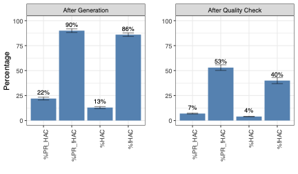 Results With the end-to-end evaluation workflow of RovoDev Code Reviewer, there are 7% (%PR_HAC) of the pull requests that contain at least one comment that is aligned with a human-written comment. Figure 7-right shows that, after the quality check stage, RovoDev Code Reviewer can generate 4% of the comments that are aligned with human-written comments, but still producing a moderately high number (40%) of comments that are not aligned with human-written comments. Nevertheless, it is important to note that a lack of alignment between RovoDev-generated and human-written comments does not necessarily imply that RovoDevâs comments are not useful as RovoDev and humans may focus differently. Therefore, the RovoDev-generated comments are still valuable, since our RQ1 shows that RovoDev Code Reviewer achieves a high code resolution rate (38.70%) (i.e., generate actionable comments that trigger a code resolution).