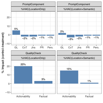 Results. Review Guideline together with Task Definition and Code Changes are the most important prompt components for code review comment generation, as it improves RovoDevâs review localization capability by 5 percentage points. Figure 8 presents the percentage impact of the prompt components on RovoDevâs effectiveness. Positive impact indicates the positive benefit that a component contributes to RovoDev (i.e., an absolute percentage loss when such the treatment component is removed from the control group). The results show that the review guideline contributes 5% positively to the RovoDevâs review localization. In other words, when the review guideline is removed from the control group, %HAC(LocationOnly) of RovoDev is decreased by 5 percentage points. Nevertheless, other types of contextual information (e.g., persona, Chain-of-Thought, PR information, and Jira Information) have a minimal impact on the RovoDevâs review localization and generation capabilityâthe absolute percentage difference is only 1%-3%. For Jira issues and pull requests, our deeper investigation found that such information is generally high-level and lack sufficient detail to effectively generate code review comments. For persona, this finding is similar to the literature âi.e., persona does not have much impact on the code review automation.