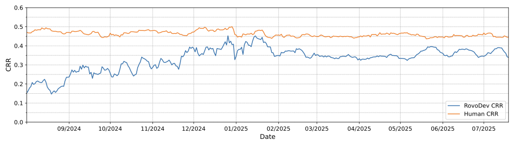 . RovoDev Code Reviewer achieves a code resolution rate of 38.7%, which is 12.9% less than the code resolution rate of human-written comments (44.45%). Figure 3 presents the Code Resolution Rate (CRR) of RovoDev-generated comments and human-written comments over a one-year period (Aug 2024 to July 2025), using a rolling average of 7-day (i.e., an average CRR value within a moving window of 7-days). This one-year period includes the beginning of RovoDevâs internal dogfooding (Aug 2025) to the widespread enablement, until July 15 2025. When considering the recent one-week period between July 10 2025 and July 15 2025, RovoDev Code Reviewer achieves a code resolution rate of 38.70%, while human-written comments achieves a code resolution rate of 44.45%. This leads to a maximum difference of 5.8 percentage points, or a relative percent difference of just 12.9% ($`\frac{38.70-44.45}{44.45}`$) from the code resolution rate of human-written comments, highlighting the high practical value and quality of RovoDev-generated code review comments. In addition, the most resolved types of code review comments are related to readability, bugs, and maintainability .