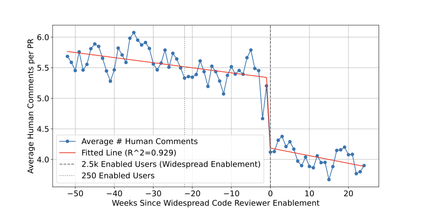 Figure 6 shows the average of human comments per PR over Atlassianâs repositories per week. As with the PR cycle time analysis, it covers 77 weeks of observations, 52 weeks before and 24 weeks after widespread enablement. We perform the same interrupted time series analysis using OLS, using the same binary intervention variable.