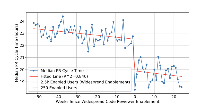 In order to confirm this result is not due to sample bias, we then calculate RovoDev Code Reviewerâs impact on Atlassianâs PR cycle time immediately after widespread enablement. Figure 4 shows the median PR cycle time in enabled Atlassian repositories per week. It covers 77 weekly observations, spanning from 52 weeks before to 24 weeks after Code Reviewerâs widespread internal enablement. From these observations, we perform an interrupted time series analysis using ordinary least squares (OLS) regression to evaluate the impact of RovoDev Code Reviewer on the PR cycle time, as shown in the red line in Figure 4. The model includes a binary intervention variable indicating the introduction of the RovoDev Code Reviewer (i.e., at week 0). The analysis reveals a statistically significant reduction in the median pull request cycle time following the widespread internal enablement of RovoDev Code Reviewer.