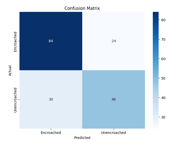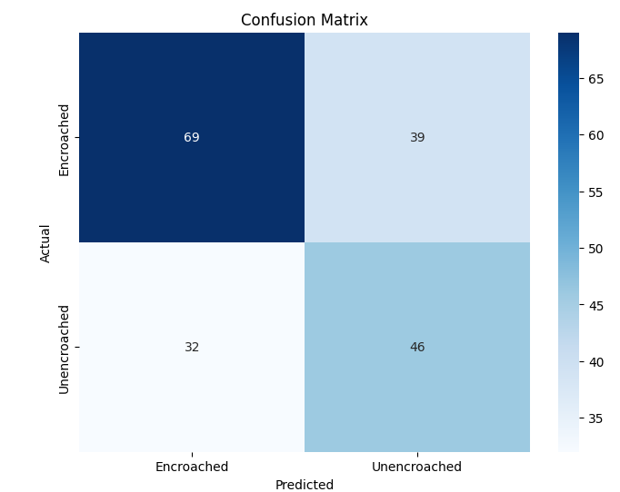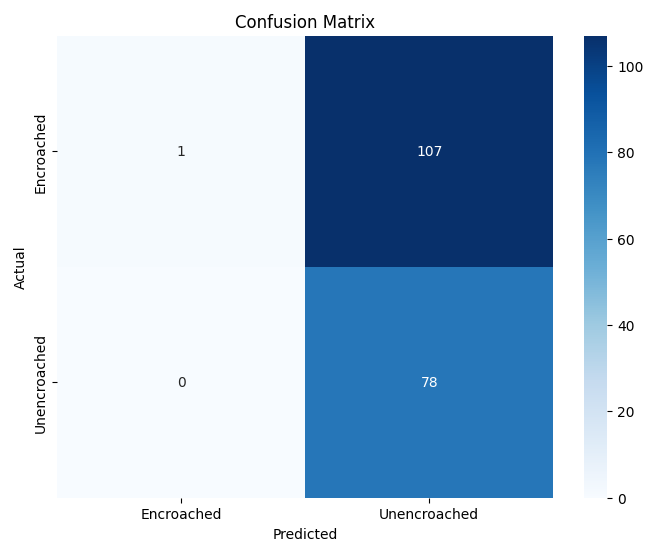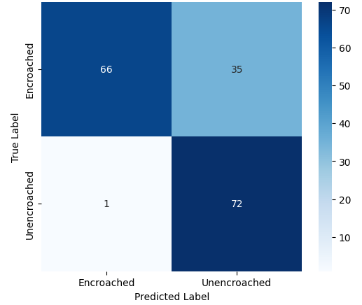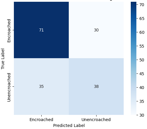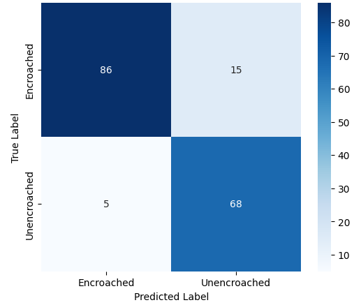 The evolved custom baseline confusion matrix for the Footpath dataset is presented earlier in Figure 2. Figure 7 illustrates the confusion matrices for the four pretrained and transfer learning variants, offering insight into their class-wise prediction behavior on the Footpath test set. Notably, the transfer learning variant of MobileNetV2 demonstrates a well-balanced distribution between the Encroached and Unencroached classes, consistent with its strong overall accuracy and F1-score. In contrast, EfficientNetB0 under transfer learning exhibits a pronounced bias toward the majority class, resulting in reduced recall for the minority category. The pretrained variants also show elevated misclassification rates for encroached regions. Overall, these findings underscore that lightweight architectures—when selectively fine-tuned—can achieve more balanced class-wise predictions.