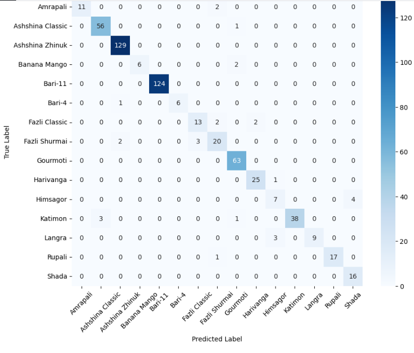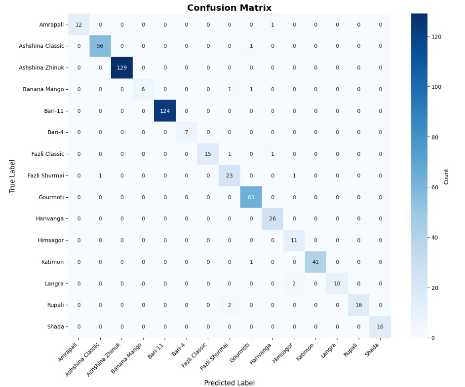 The enhanced custom baseline model achieved the highest overall performance on MangoImageBD, reaching an accuracy and F1-score of 0.98. This underscores the benefit of deeper architectures with bottleneck residual blocks in fine-grained multiclass recognition, where subtle visual distinctions demand greater representational power. Though this comes at the cost of increased training time and a larger parameter footprint, the performance gains justify the trade-off in high-accuracy settings.