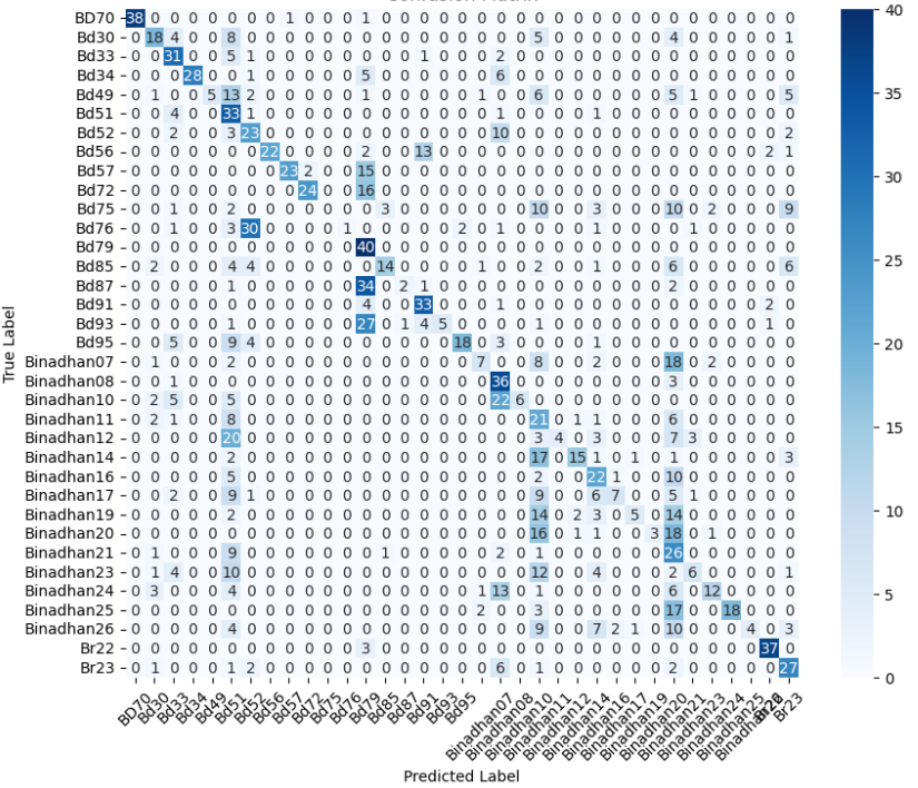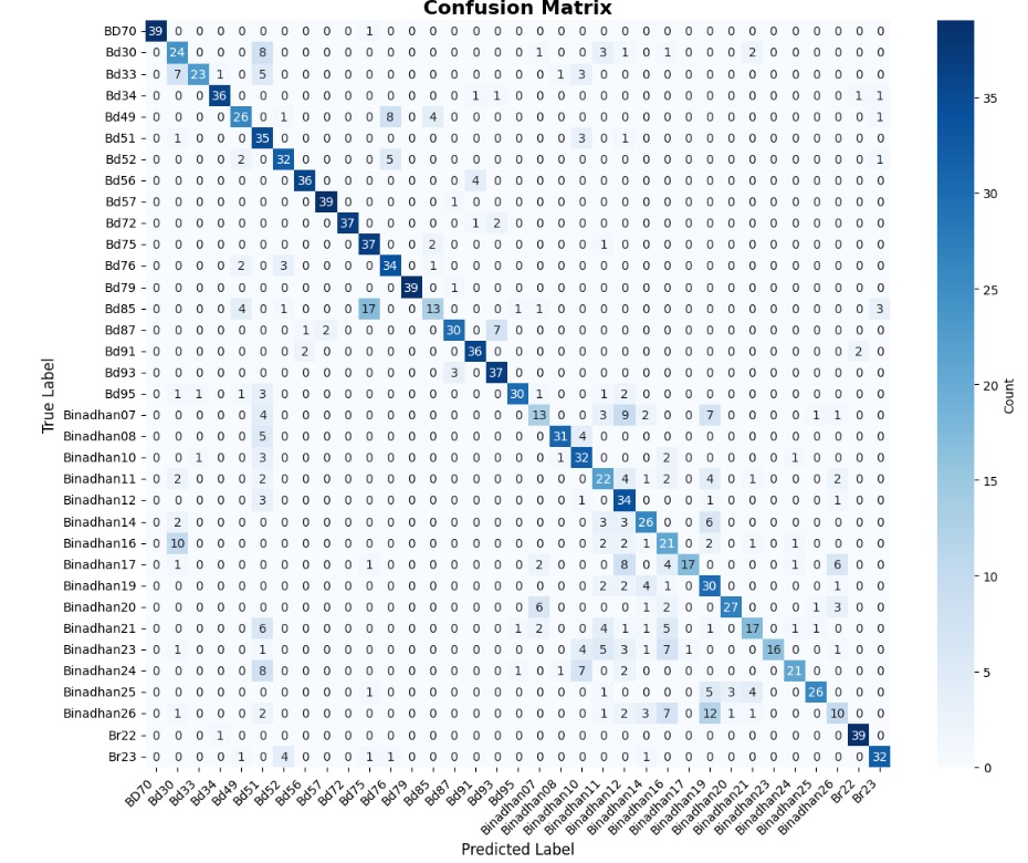 The enhanced custom CNN baseline achieved the strongest overall performance on the PaddyVarietyBD dataset, with an accuracy and F1-score of 0.71. This indicates that increased depth and bottleneck residual blocks are effective for capturing the subtle inter-class variations present in fine-grained paddy grain imagery—though at the cost of significantly higher training time and model size.