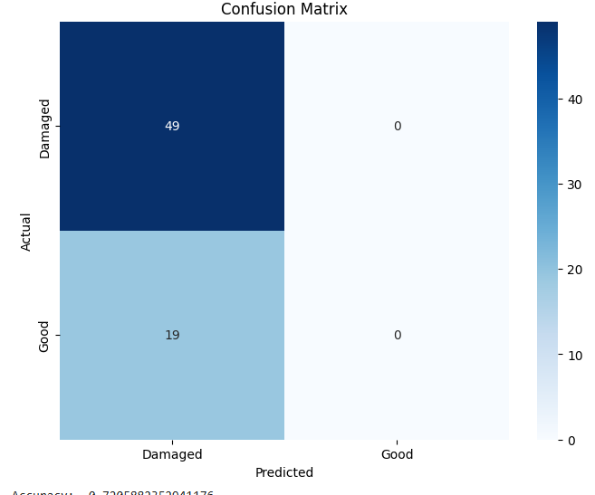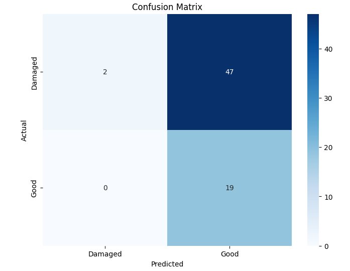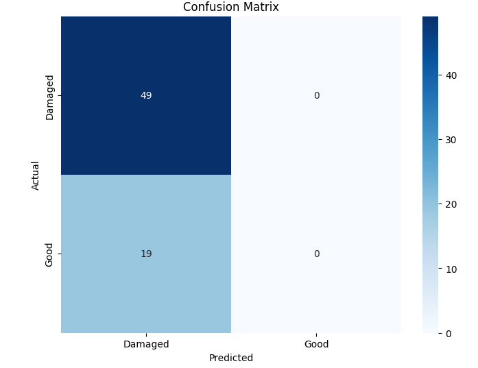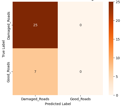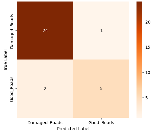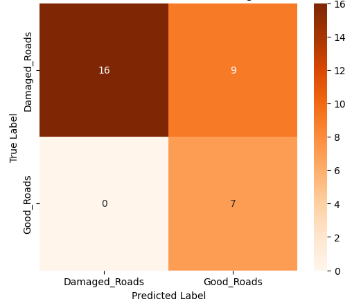 The evolved custom baseline confusion matrix is already presented in Figure 1. Figure 6 now presents the confusion matrices for all four pretrained and transfer learning variants, illustrating their class-wise prediction behavior on the Road Damage test set. Notably, EfficientNetB0 (Transfer Learning) exhibited perfect recall for the majority “Damaged” class but failed to predict any “Good” class instances, highlighting the impact of class imbalance on fixed-feature models. Interestingly, MobileNetV2 (Transfer Learning) achieved a class-wise prediction distribution that closely resembles the much heavier pretrained EfficientNetB0, demonstrating its robustness despite a lightweight architecture.