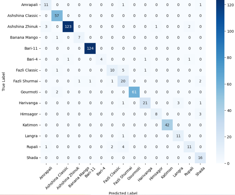 The trade-offs shift markedly for fine-grained multiclass classification tasks. On MangoImageBD and PaddyVarietyBD, deeper custom CNNs with bottleneck residual blocks achieved the strongest overall performance, particularly in terms of F1-score and class-wise discrimination. These gains came at the expense of increased model size and training time, with trainable parameters approaching 90 MB and per-epoch training times reaching approximately 36 seconds for MangoImageBD and 88 seconds for PaddyVarietyBD. While pretrained EfficientNetB0 models also performed competitively, transfer learning variants generally exhibited reduced recall and increased confusion among visually similar classes, indicating limited adaptability when the backbone is frozen. Thus, efficiency gains from transfer learning often resulted in diminished accuracy for highly granular recognition tasks.