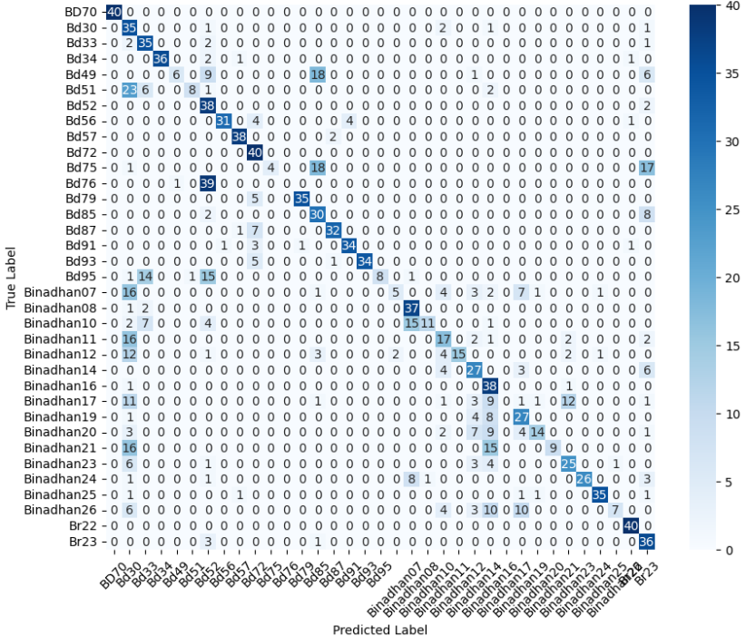 Both transfer learning variants exhibited reduced performance on this dataset. In particular, EfficientNetB0 (Transfer Learning) showed a notable drop in recall, indicating limited adaptability when the backbone is frozen. Although transfer learning significantly reduced training time and the number of trainable parameters, these results suggest that fine-grained multiclass tasks such as PaddyVarietyBD benefit from full feature adaptation or deeper custom architectures. Overall, the findings highlight a trade-off between computational efficiency and classification performance for highly granular visual recognition problems.