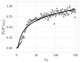 We restrict the analysis to $`n_S \leq 150`$, as beyond this threshold the probability saturates at $`1`$. Overall, we observe that $`\textrm{P}(R^* \mid n_S)`$ increases monotonically with the number of stimuli (MannâKendall test , $`p < .0001`$). This finding is consistent with prior human-centered studies showing that the likelihood of content adoption increases with repeated exposure .