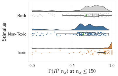 To further contextualize these differences, Figure 5 reports the distributions of toxic response probabilities for $`n_S \leq 150`$, grouping stimuli into three categories: âNon-toxicâ, âToxicâ, and âBothâ. The differences between the distributions are statistically significant, including the comparison between the âNon-toxicâ and âBothâ groups (MannâWhitney U test, $`p = .01`$), indicating that even partial exposure to toxic content (âBothâ group) is associated with an increased likelihood of toxic responding.