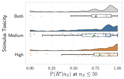 Figure 6 illustrates the probability of toxic responses as a function of exposure to medium- and high-toxic stimuli. We limit the analysis to $`n_S \leq 50`$, since the probability saturates beyond this point. Both curves exhibit a monotonic increase (MannâKendall test, $`p < .0001`$), yet the two distributions are not statistically distinguishable (MannâWhitney U test, $`p = 0.117`$).