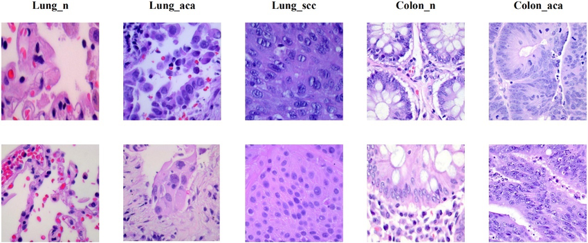 The LC25000 dataset contains 25,000 de-identified, HIPAA-compliant, and validated color images [28]. It comprises five classes: colon adenocarcinoma, benign colonic tissue, lung adenocarcinoma, lung squamous cell carcinoma, and benign lung tissue, each containing 5,000 images. The images were initially cropped to 768 x 768 pixels before enhancements such as left and right rotations (up to 25 degrees, with a 1.0 probability) and horizontal and vertical flips (with a 0.5 probability) were applied [29]. The data was then split into 60% for training, 20% for validation, and 20% for testing. Figure 1 shows samples from each class in the dataset.