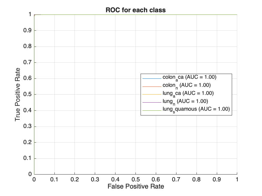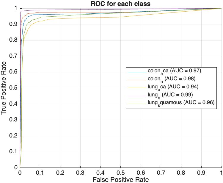 ongoing adjustments to the datasetās intricate features, reflecting a dynamic learning process aimed at minimizing classification errors. The ROC curves for all five classes of histopathological images, shown in Figure 2(b), exhibit high true positive rates and low false positive rates across all classes. The model achieved a notable classification accuracy of 96.01%, with an average AUC of 96.8%, indicating strong overall performance.