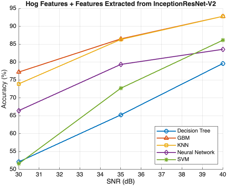 the Decision Tree modelās accuracy improved from approximately 50% at 30dB to about 75% at 40dB, while more sophisticated models like GBM, KNN, Neural Network, and SVM achieved accuracies above 85% at 40dB. However, at 30dB, GBM attained an accuracy above 80%, with KNN following closely at 75.04%, while the Neural Network and SVM achieved significantly lower accuracies of 71.65% and 66.53%, respectively. On the other hand, with the combination of HOG features with deep features, as illustrated in Figure 2(b), all models attained similar levels of accuracy at 40dB compared with the performance of the models using deep feature extraction alone. Furthermore, there was little improvement observed with the Decision Tree