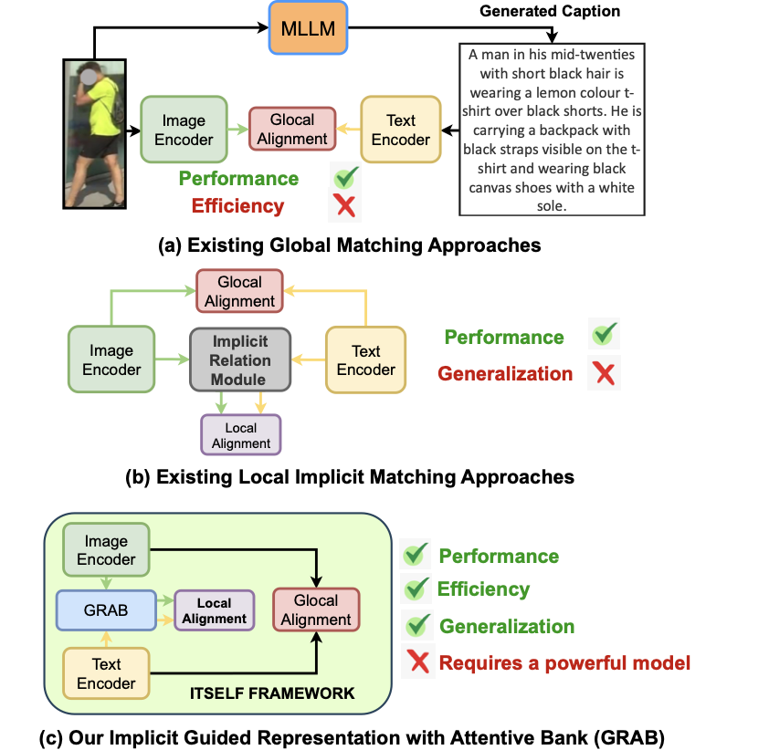 ITSELF Framework: A novel attention-guided implicit local alignment framework, ITSELF, with GRAB leveraging encoder attention to mine fine-grained cues and reinforce global alignment without additional supervision.