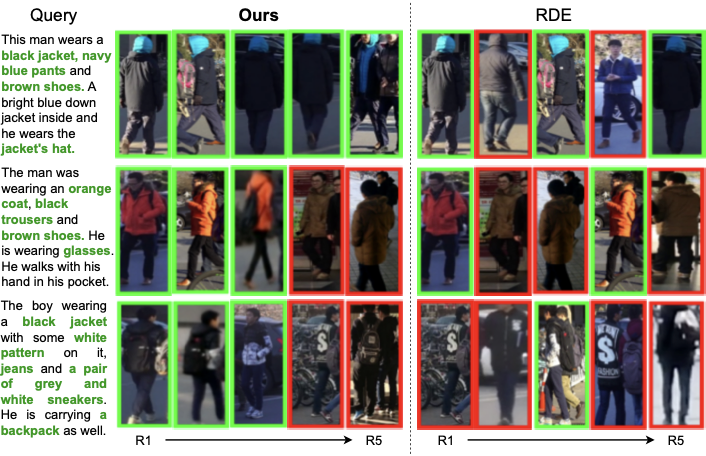 Top-5 Retrieval Examples. 4 qualitatively demonstrates our methodâs superiority over RDE on the RSTPReid benchmark. For a query about a man in a black jacket and blue down jacket, our method retrieves all five correct matches, whereas RDE finds only three. With a query for a man in an orange coat with a hand-in-pocket pose, our approach correctly retrieves three images in the top ranks, while RDE secures only two, ranking the second true positive fourth. For a boy in a black jacket with white patterns, our method again excels with three correct top-ranked retrievals, contrasting with RDEâs single correct match at R3. These examples highlight our frameworkâs enhanced ability to align fine-grained textual descriptions with relevant visual details.