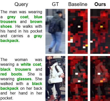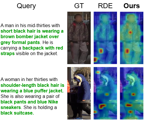 Attention Comparison. 5 presents Grad-CAM visualizations comparing RDE and our method. Our approach achieves sharper localization by focusing on query-specific elements (e.g., clothing and accessories) with minimal spillover, effectively isolating the target pedestrian in multi-person scenes. In contrast, RDE produces diffuse, often irrelevant hotspots, leading to fragmented text-image associations. These results highlight our frameworkâs stronger attribute-level fidelity and reduced cross-identity confusion, crucial for real-world person search.