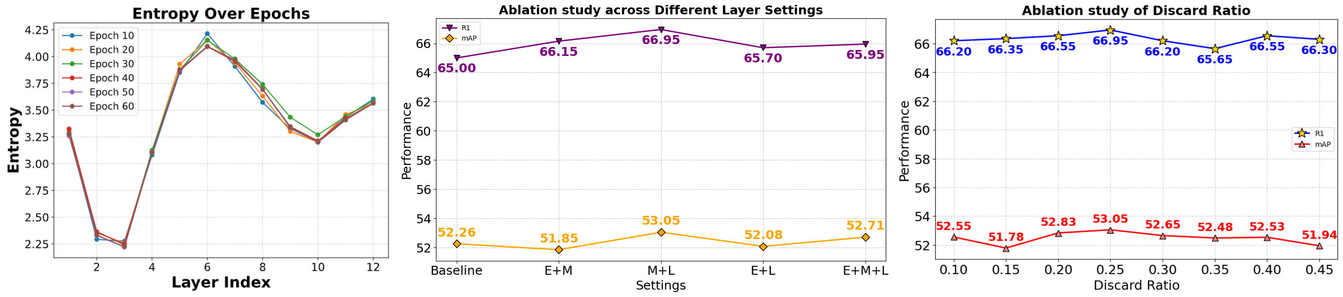 Analysis of Layer Selection and Discard Ratio in MARS: From the middle plot in 7, multi-layer configurations in MARS consistently outperform the baseline, with the Middle+Late (M+L) combination achieving the best R1 and mAP among all layer-type combinations (E, M, L and their pairings). The left plot explains why: early layerâs attention (notably layer 3) have the lowest entropy, meaning attention is sharply peaked on a few low-level tokens (edges/textures or background), which offers weak semantic grounding and can inject noise when fused. By contrast, middle layers show the higher entropy, capturing broader context and relations, while late layers re-focus attention onto salient, semantic regions. Fusing “M+L” therefore balances contextual coverage with discriminative focus, outperforming any option that includes Early Layerâs Attention. Finally, the right plot shows the best performance at a discard ratio of 0.25, indicating that removing a small fraction of low-attention tokens during fusion filters noise and sharpens discriminative cues.