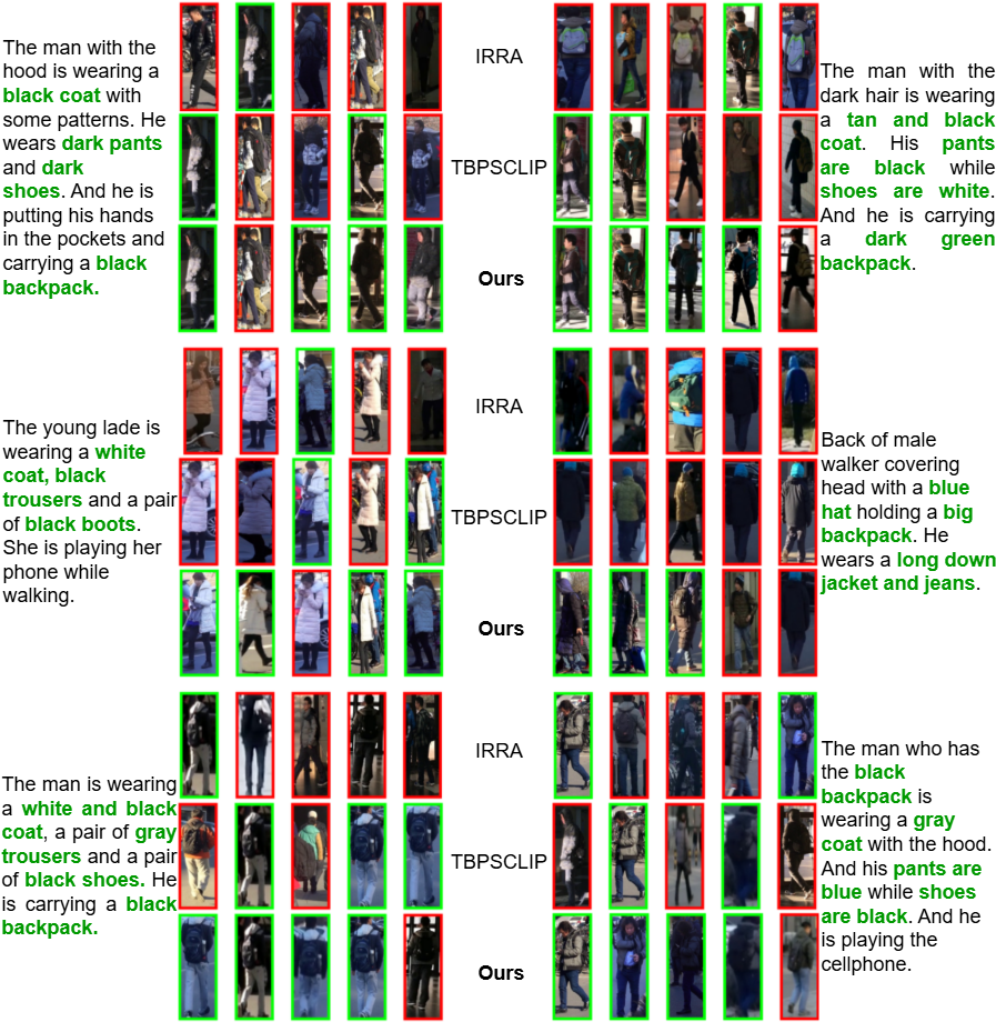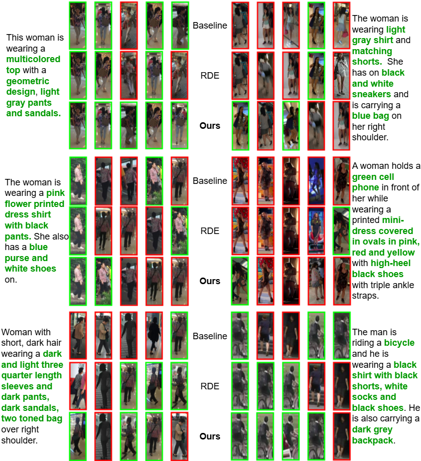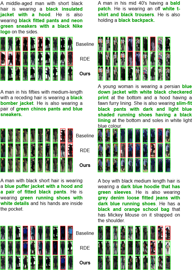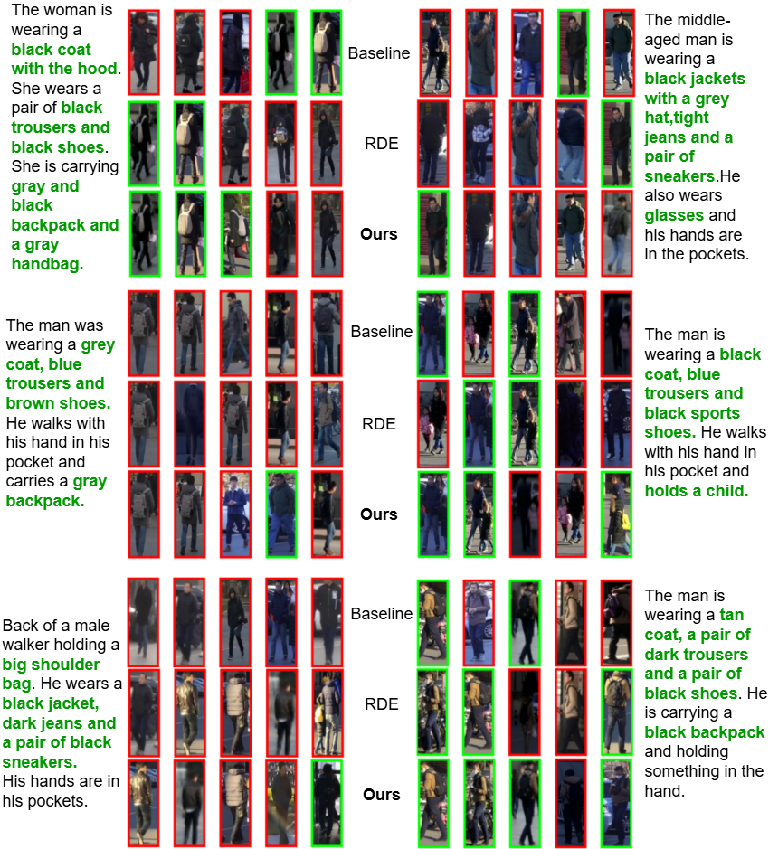 More Retrieval Results. 8, 9, 10 and 11 provide additional qualitative comparisons across the CUHK-PEDES, ICFG-PEDES, and RSTPReid benchmarks. The examples consistently demonstrate that our method retrieves visually and semantically accurate matches, even in challenging cases involving fine-grained attributes, small accessories, and visually similar distractors. Compared to the baseline, RDE , and other strong methods such as IRRA and TBPSCLIP , our approach shows superior robustness in capturing subtle cues like clothing textures, color combinations, and carried objects (e.g., backpacks, purses, or phones). Notably, our model remains reliable under domain shifts, handling diverse scenarios ranging from crowded street scenes to low-light images. These results further validate the effectiveness of our framework in producing more discriminative and generalizable text-image alignments.