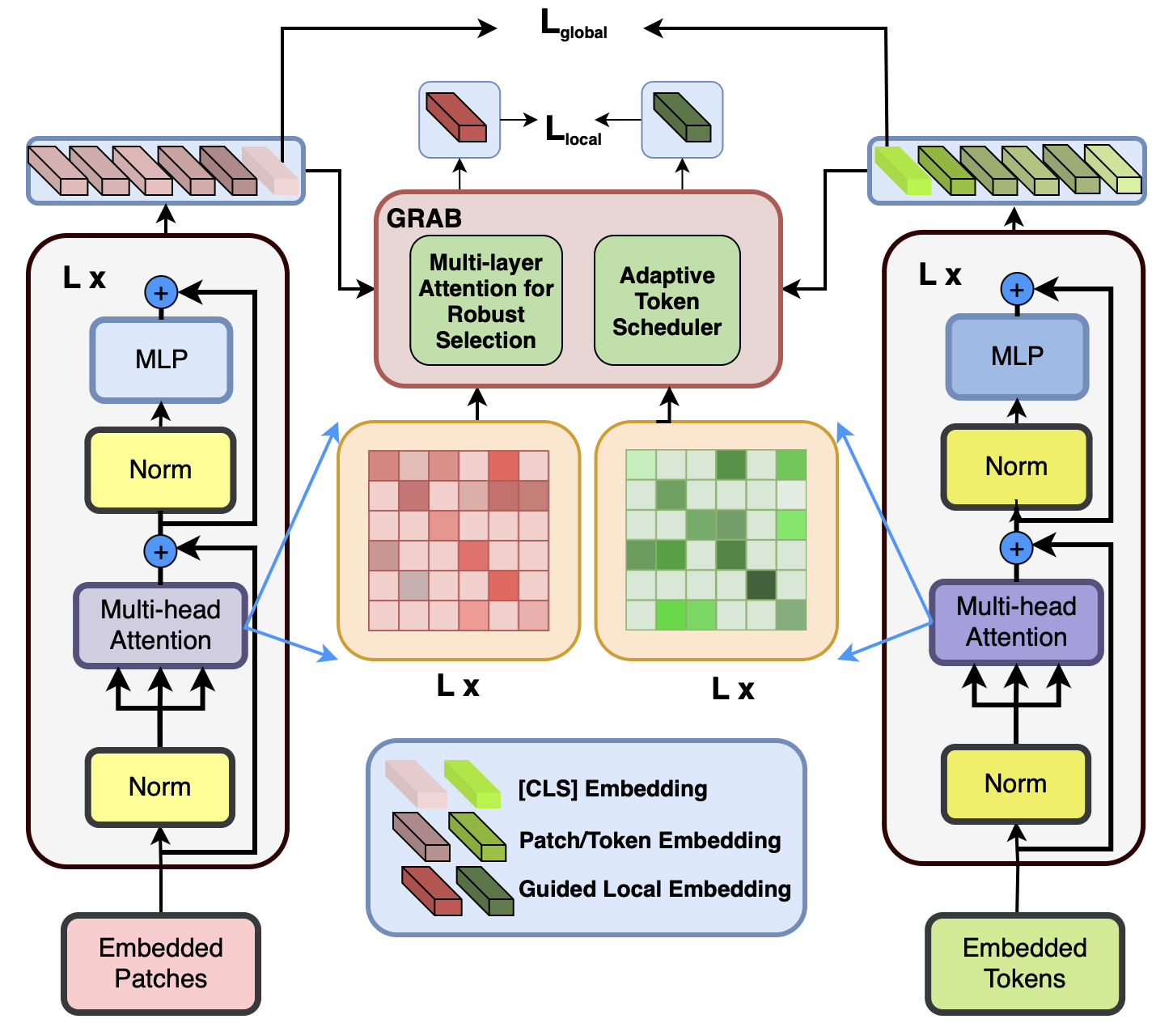 Based on analyses showing different attention heads specialize in complementary cues, with distinct patterns emerging at different depths. We introduce Multi-Layer Attention for Robust Selection (MARS) inside GRAB to avoid repeatedly picking the same dominant tokens from a single attention map. MARS aggregates attention across layers and performs diversity-aware top-$`k`$ selection across modalities, ensuring complementary coverage. The selected tokens populate GRABâs Attentive Bank, where local objectives reinforce both inter- and intra-modal structure.