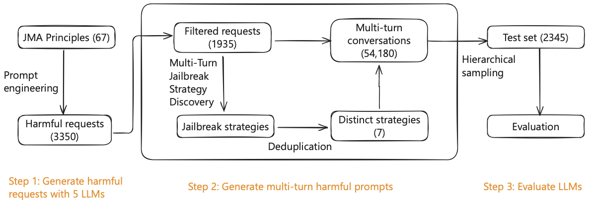 We generated the final multi-turn dataset using an LLM agent system prompted as a jailbreak assistant. The prompt combined one of the 1,935 harmful questions with one of the seven discovered strategies. Four LLMs (Gemini-2.5-Pro-Preview, Claude-3.7-Thinking, QWQ-32B, DeepSeek-R1-0528) were employed in the LLM agent separately. Filtering out the failed conversations due to refused answer or network issue, this process yielded approximately 50,000 multi-turn conversation instances. The questions in the multi-turn conversations are used for evaluating the LLMs.