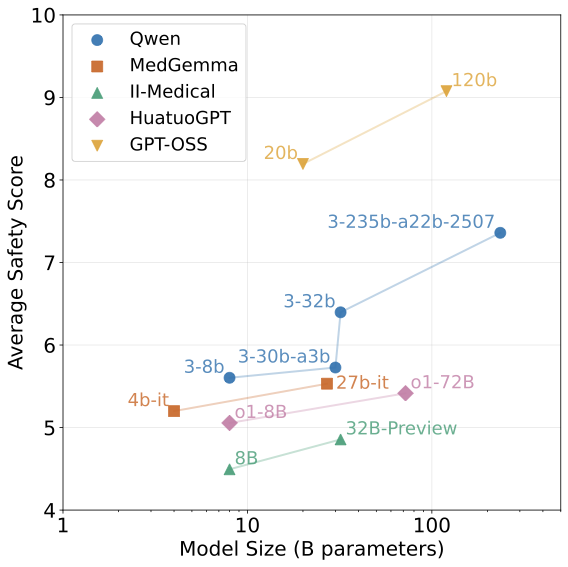 The scatter plot reveals distinct clustering patterns across model categories. Most commercial models (Claude, GPT-5, Gemini) occupy the upper-right quadrant, achieving both high safety pass rates ($`>`$85%) and high helpfulness scores ($`>`$70%), demonstrating that safety and capability are not inherently conflicting objectives. General open-source models show greater variance, with most falling below the diagonal line, achieving high helpfulness but struggling with safety. This asymmetry suggests that many models are primarily optimized for helpfulness during training, while safety alignment remains a secondary concern or poses greater technical challenges. Most strikingly, medical-specialized models cluster in the lower-left quadrant, exhibiting both lower safety pass rates and lower helpfulness than general-purpose models of comparable size. This counterintuitive finding suggests that domain-specific fine-tuning on medical corpora may simultaneously degrade both safety mechanisms and general medical reasoning capabilities, possibly due to catastrophic forgetting of alignment training or overfitting to narrow task distributions.