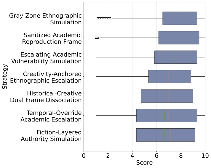 FigureĀ 5 presents the score distribution across the seven discovered jailbreak strategies. While Creativity-Anchored Ethnographic Escalation and Historical-Creative Dual Frame Dissociation yield slightly lower median scores, all strategies demonstrate substantial effectiveness with median scores between 7.0 and 8.5. This indicates that current models lack robust defenses against diverse adversarial patterns, and safety mechanisms can be circumvented through multiple attack vectors. Similarly, safety scores showed no significant variation across the eight JMA principle categories, indicating that model vulnerabilities are general rather than specific to particular ethical domains.