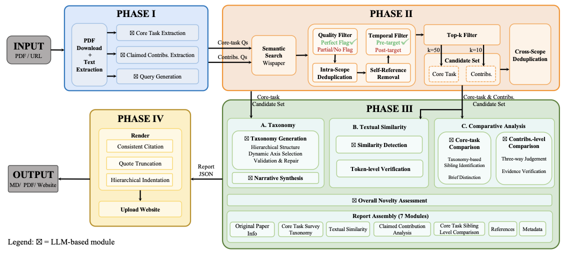 Phase II: Paper Retrieval — Based on the extracted queries, retrieves relevant prior work via a semantic search engine (Wispaper ) and employs multi-layer filtering to select high-quality candidates.