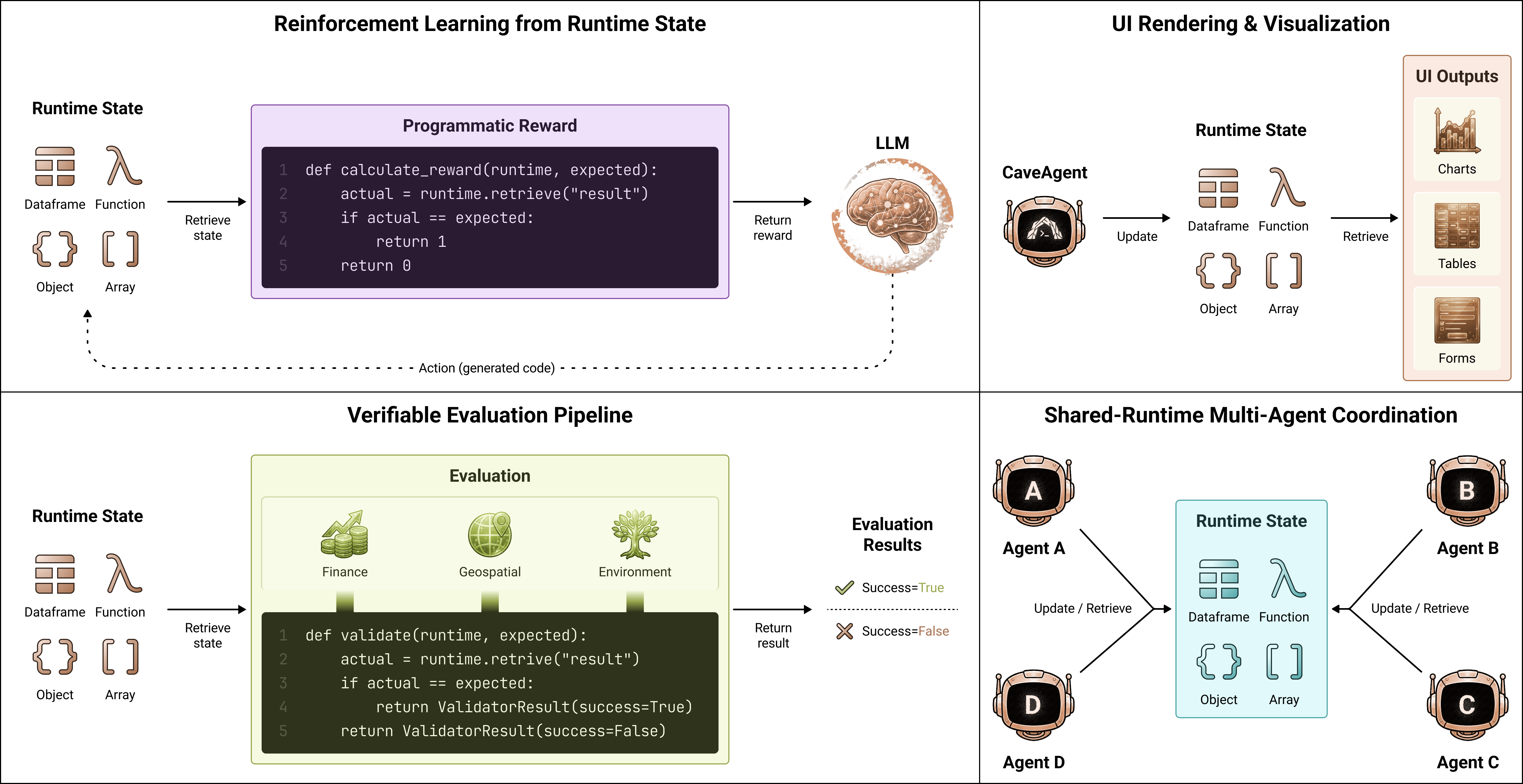 We conduct evaluations demonstrating CaveAgentās tool use ability on standard benchmarks (e.g., Tau$`^2`$Bench) and provides comprehensive case study across various domains to showcase the unique advantages of CaveAgent. Additionally, we identified the potential to extend the paradigm to enable Stateful Runtime-Mediated Multi-Agent Coordination and provided qualitative results, opening the opportunity for future research on this direction.