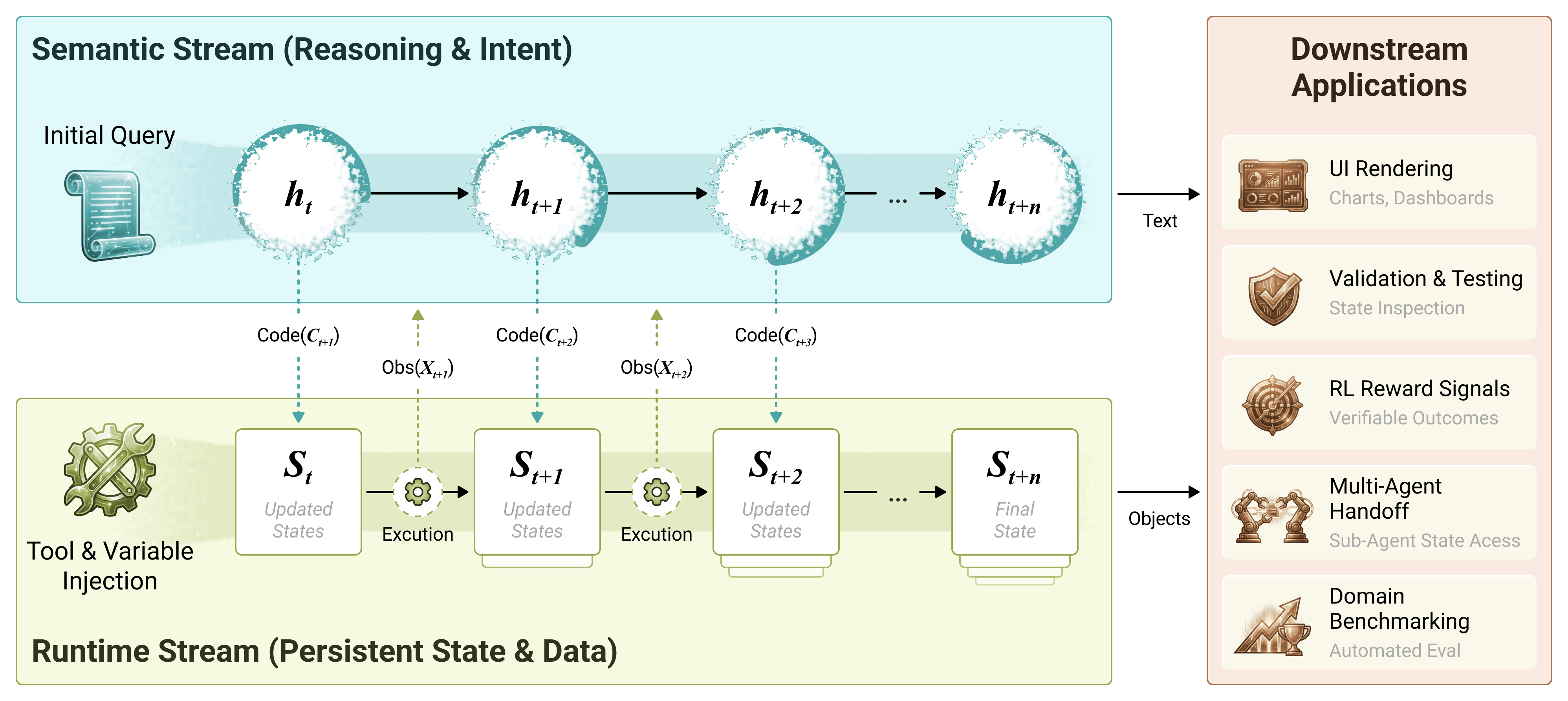 \mathcal{S}_t &= \text{Exec}(c_t, \mathcal{S}_{t-1}) \quad &(\text{Runtime Stream: Persistent Environment})