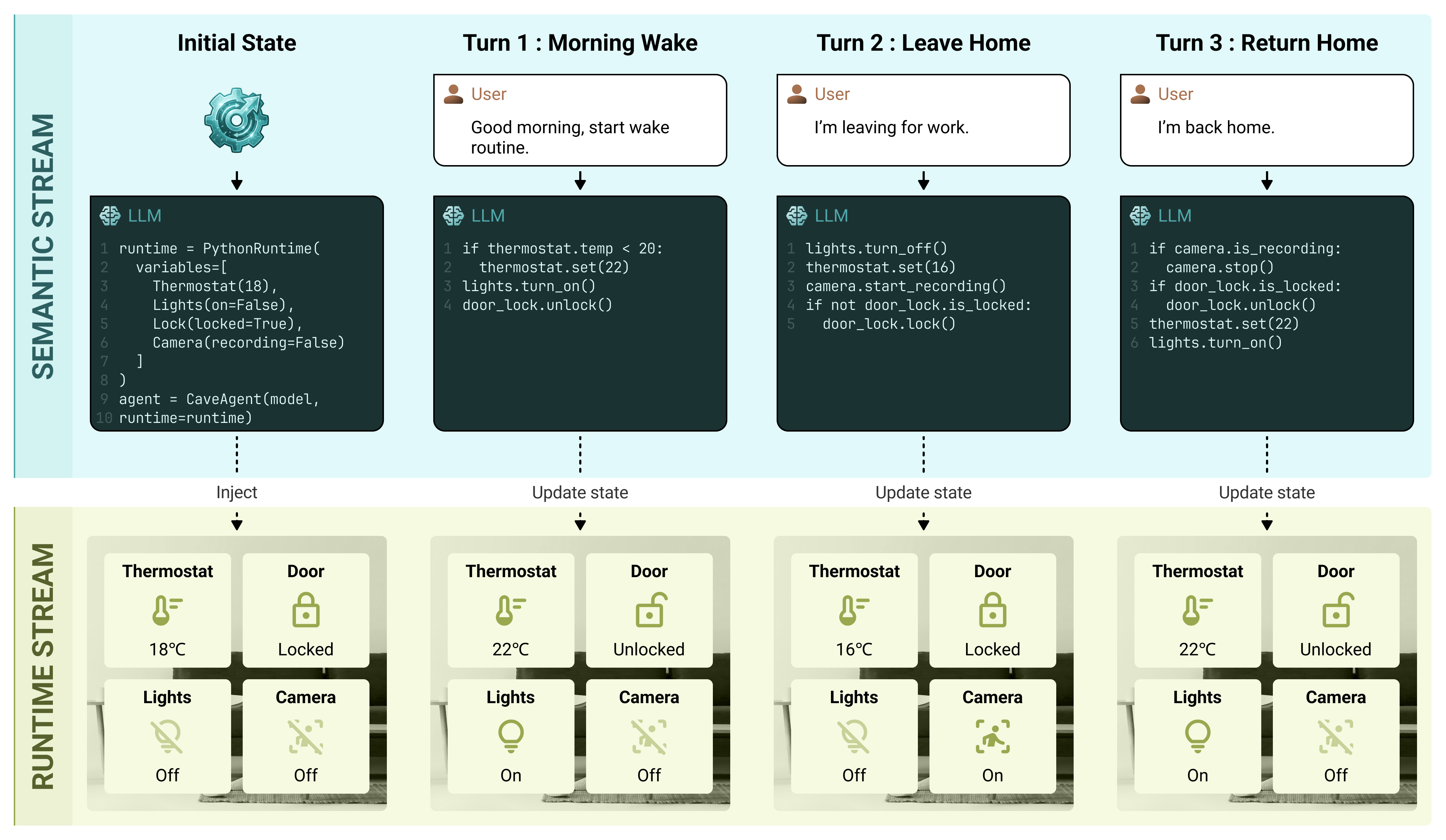 Thermostat,Door) are initialized once and retain their state across multiple turns, eliminating the need to hallucinate or re-query context. -