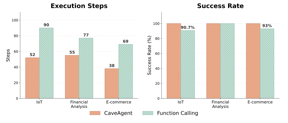 benchmark. CaveAgent achieved a 72.8% success rate (83/114) compared to