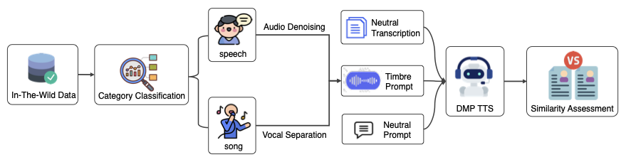 Constructing a dataset for zero-shot voice cloning requires decoupling speaker timbre from other acoustic factors (e.g., emotion, background noise) while maintaining high identity similarity. As illustrated in FigureĀ 2, we implemented a rigorous synthetic data construction pipeline using DMP-TTSĀ , a zero-shot text-to-speech model.