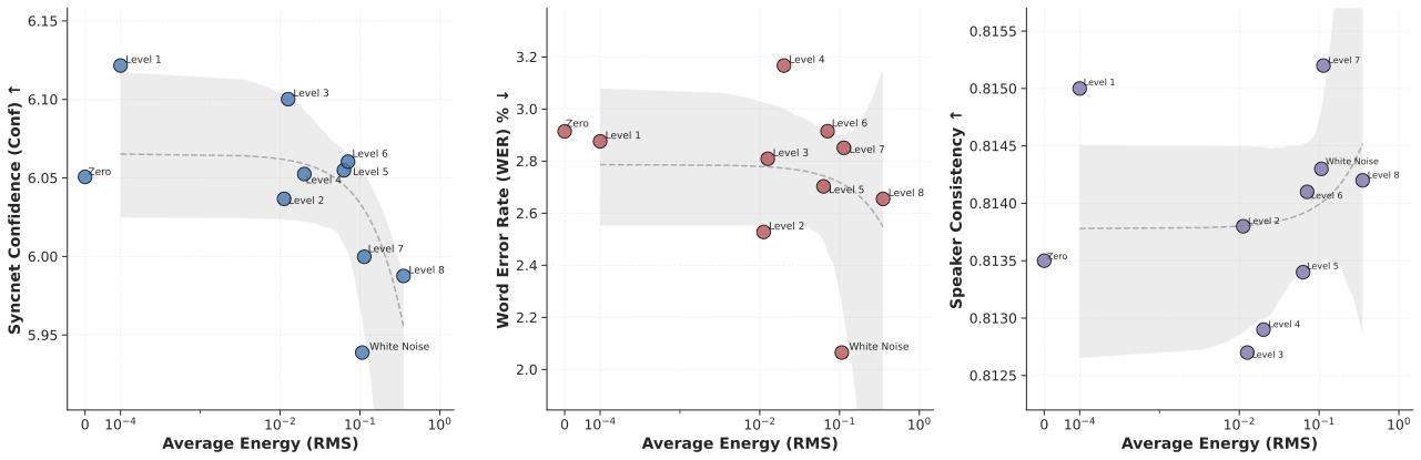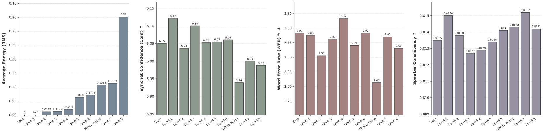 Analysis of Negative Conditioning Strategies. As illustrated in FigureĀ 3 and Figure4, varying the energy levels of Gaussian white noise reveals a trade-off between modalities. We observed that as the noise energy increases, syncnet confidence exhibits a gradual decline, while speaker consistency shows a slight upward trend. However, these variations across Gaussian energy levels remain relatively marginal, suggesting that merely