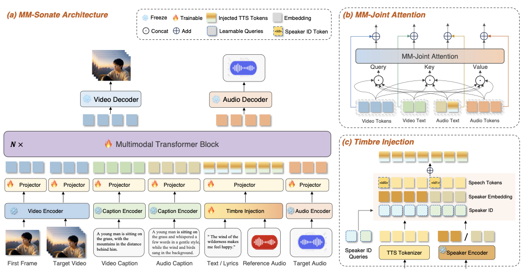 As illustrated in FigureĀ 1, MM-Sonate introduces a multimodal controllable framework for joint audio-video generation with zero-shot timbre cloning capabilities. During training, the instruction encoder, speaker encoder, video encoder, video decoder, audio encoder, and audio decoder remain frozen as pre-trained modules. The first-layer joint diffusion transformer takes temporally concatenated instruction embeddings and phoneme embeddings as text-modal conditioning inputs, while receiving noised mel-spectrogram VAE latents as audio-modal inputs and noised video VAE latents as video-modal inputs. Beyond generating video content from natural language descriptions, the model enables multi-attribute control in speech scenarios through natural language instructions, encompassing gender, age, emotion, style, and accent attributes, while supporting multi-speaker dialogue generation. Additionally, the framework supports zero-shot timbre cloning for arbitrary speakers using reference audio inputs. For music generation scenarios, the model similarly achieves natural language control over singer characteristics (e.g., gender and age), music genre, instrumentation, melody, and emotional expression, while enabling singer voice cloning through reference audio. In sound effect generation, the model produces controlled outputs via natural language instructions.