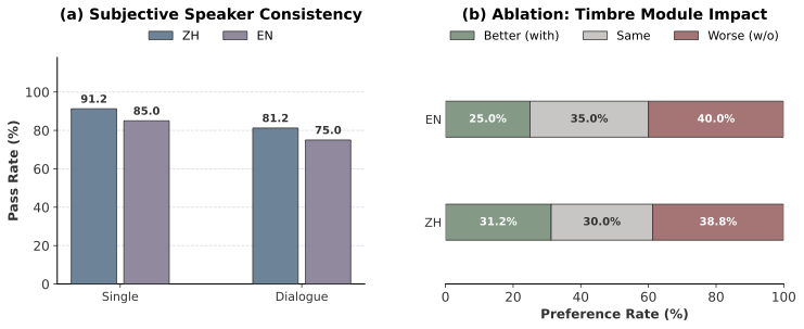 We evaluated timbre fidelity in two scenarios: (1) Single-Speaker: measuring the similarity between the cloned voice and the reference audio; and (2) Dialogue: assessing the distinctness and consistency of two separate identities within a single video. As shown in FigureĀ 5(a), MM-Sonate achieves high pass rates for both Chinese (ZH) and English (EN). Notably, in single-speaker cloning, the model reaches 91.3% (ZH) and 85.0% (EN) pass rates. In complex dialogue settings, it maintains robust identity consistency (ZH: 81.3%, EN: 75.0%), confirming its effectiveness in multi-speaker control.