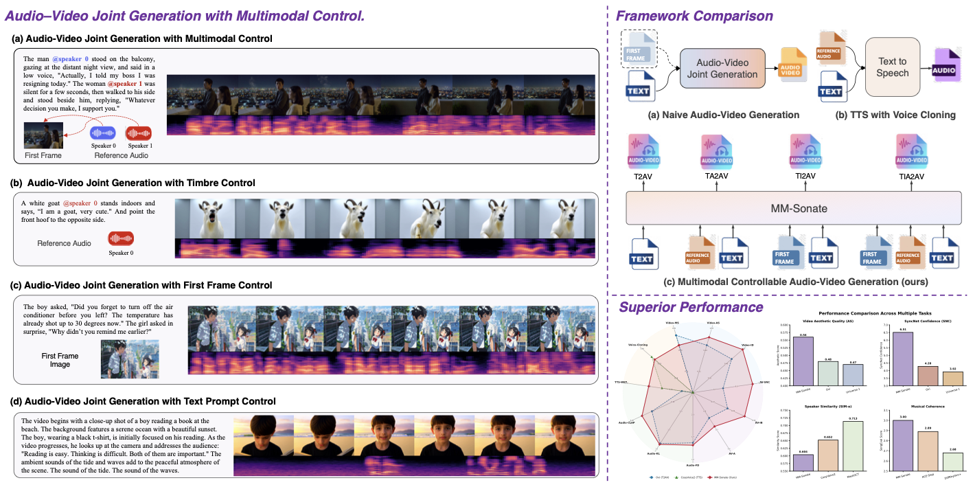 1. **MM-Sonate Framework**: MM-Sonate is a framework that can generate both audio and video simultaneously, with the capability to create new voices using reference clips. This is akin to an orchestra playing from sheet music, where text, images, and sound blend into a complete experience.-