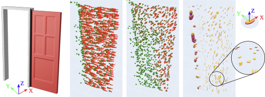 Our method involves several advances that enable robots to open visually ambiguous objects of unknown articulation. First, by changing the neural network to provide a prediction of uncertainty and by changing the articulation factor, we enabled the initial prediction of articulation to include a learned uncertainty distribution rather than a hard-coded one as before. Fig.Ā 4 shows an example network output of a sliding door with covariance largest along the $`x`$ direction, followed by $`y`$.