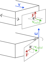 where $`\hat{\mathbf{F}} \in \mathbb{R}^3`$ is the measured reaction force measurement and $`\mathbf{v}_{valid} = \mathbf{v}+ \boldsymbol{\omega}\times \ensuremath{\mathbf{c}}`$ defines the true, valid instantaneous direction of motion for a point $`\ensuremath{\mathbf{c}}`$ on the articulated part. This relationship is demonstrated for both prismatic and revolute joints in Fig.Ā 5.