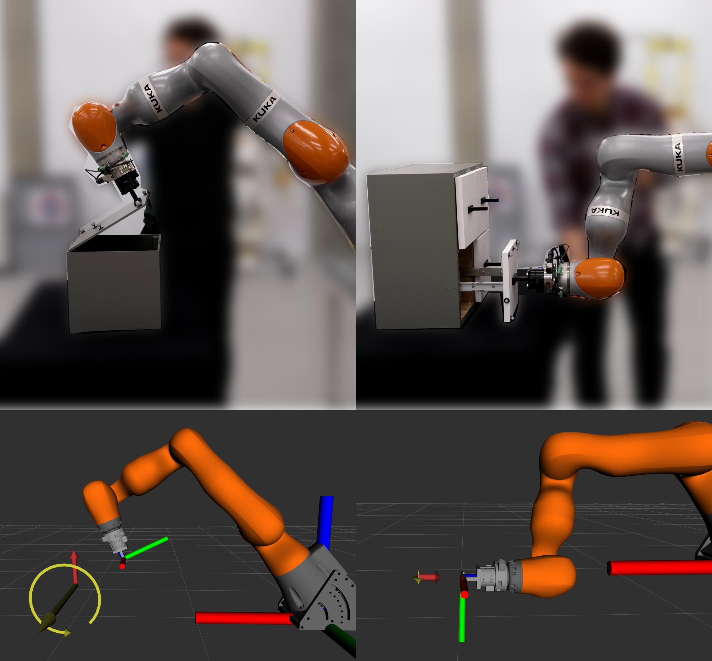 This module computes the desired robot configurationsĀ $`\ensuremath{\mathbf{q}}\in\mathbb{R}^7`$, to open the object, given the latest estimate of the articulationĀ $`\xi`$. We define the robot end-effector frame as $`\mathtt{E}`$ and model the forward kinematics of the robot end-effector asĀ $`\ensuremath{\mathbf{T}}_{\mathtt{W}\mathtt{E}}(\ensuremath{\mathbf{q}})`$.