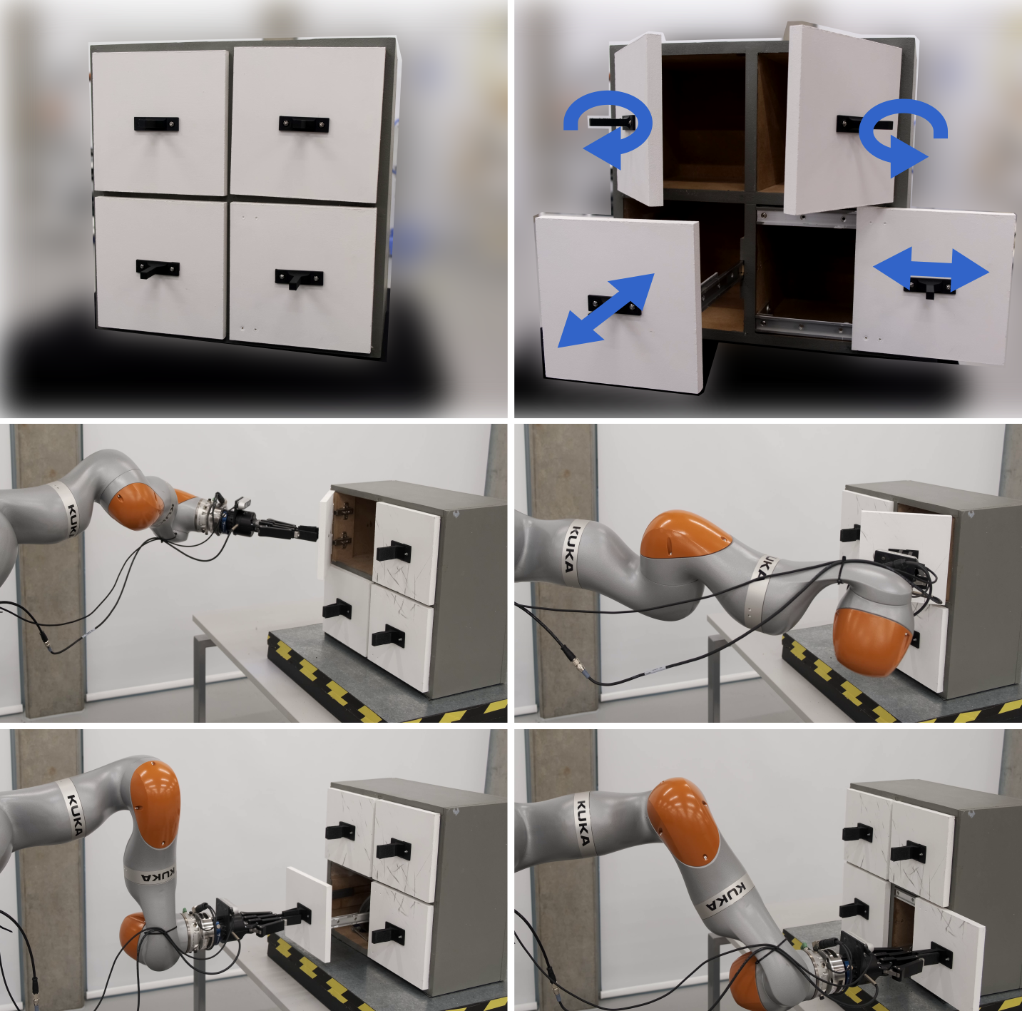 All of these learning-based works have similar limitations that hinder their use on real robots. They use only visual information and have large computational requirements, which prevents online estimation. Therefore, when they are used with real data, they typically take a single āsnapshotā of the object and make a single inference. If there is any error in the prediction, there is no way to update the estimate. Additionally, due to the reliance on recognizing visual similarity in objects compared to past training experiences, these methods exhibit poor performance on an object like in Fig.Ā 1, which has no visual indicators as to how it opens. If the predictions are wrong, then these methods are reliant on highly compliant controllers to account for the error due to a lack of online estimation.
